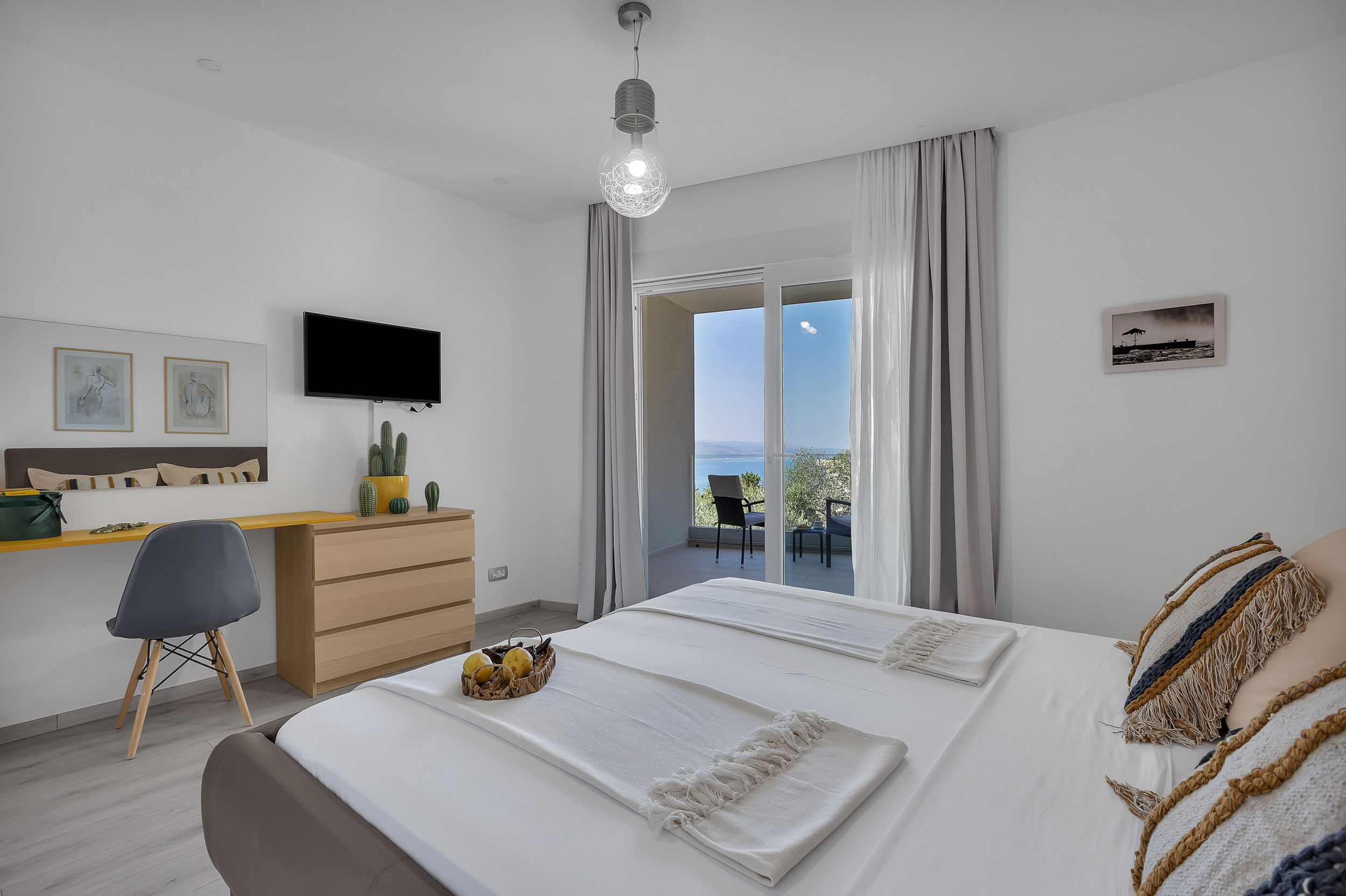The first floor features three elegantly designed bedrooms, each with its own en-suite bathroom and spacious balcony. Each room includes a 180 cm wide double bed, built-in wardrobe, and modern furnishings. From the balconies, you can enjoy breathtaking views of the sea, the islands of Brač and Hvar, and Mount Biokovo. Every room has been designed with comfort and personal style in mind.