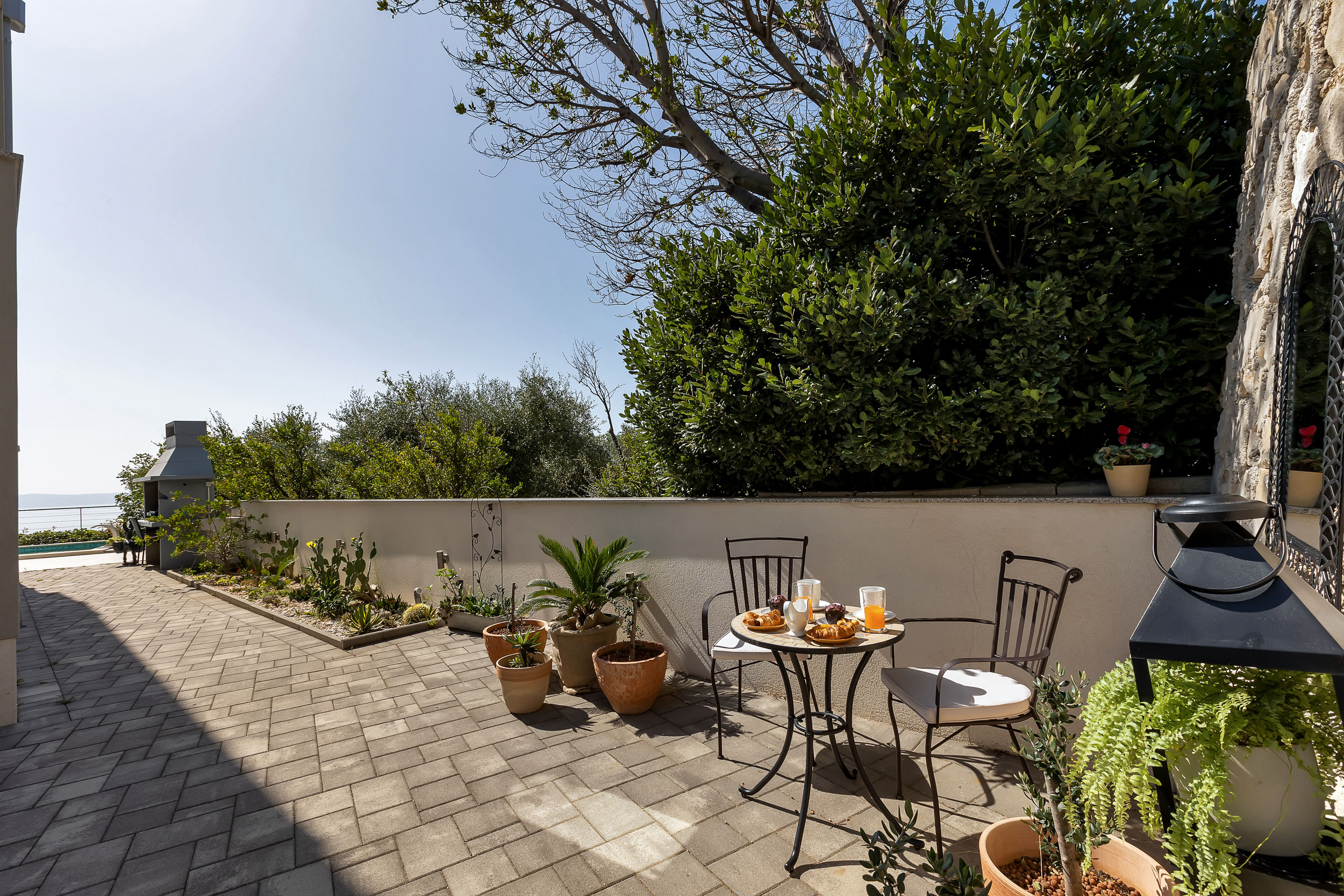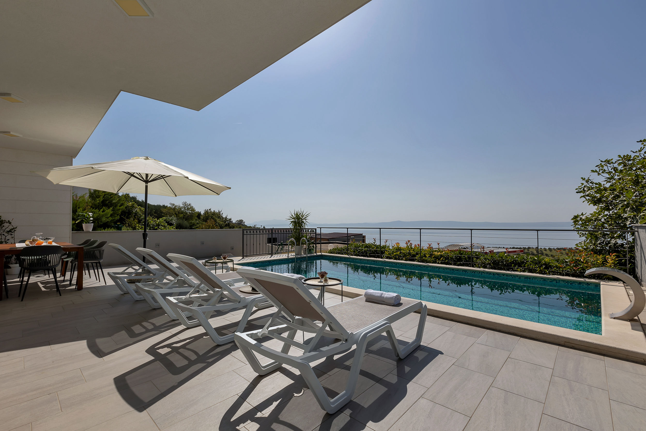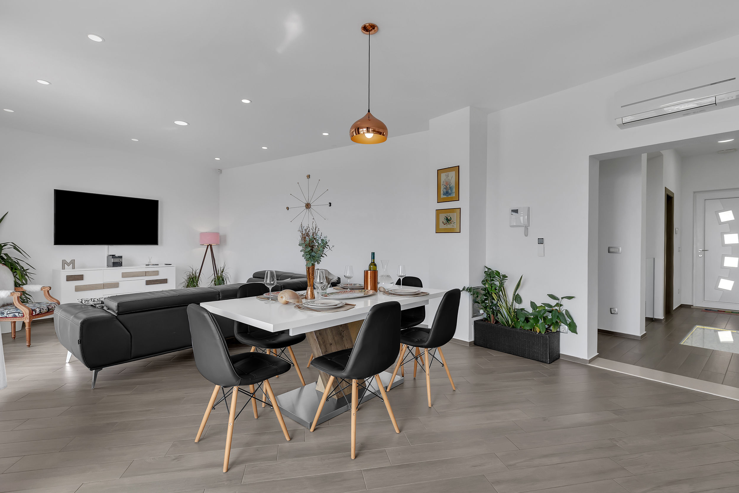 The ground floor of the villa is a perfect example of open-concept living, allowing guests to enjoy the space all year round. Three large glass doors open onto a spacious 70 m² terrace, offering stunning views of the Adriatic Sea. Whether you're cooking, dining, or relaxing on the large leather sofa, the atmosphere is always inviting.