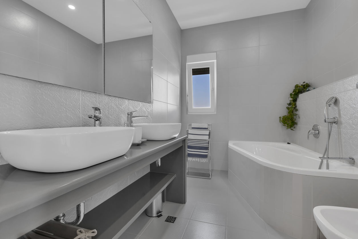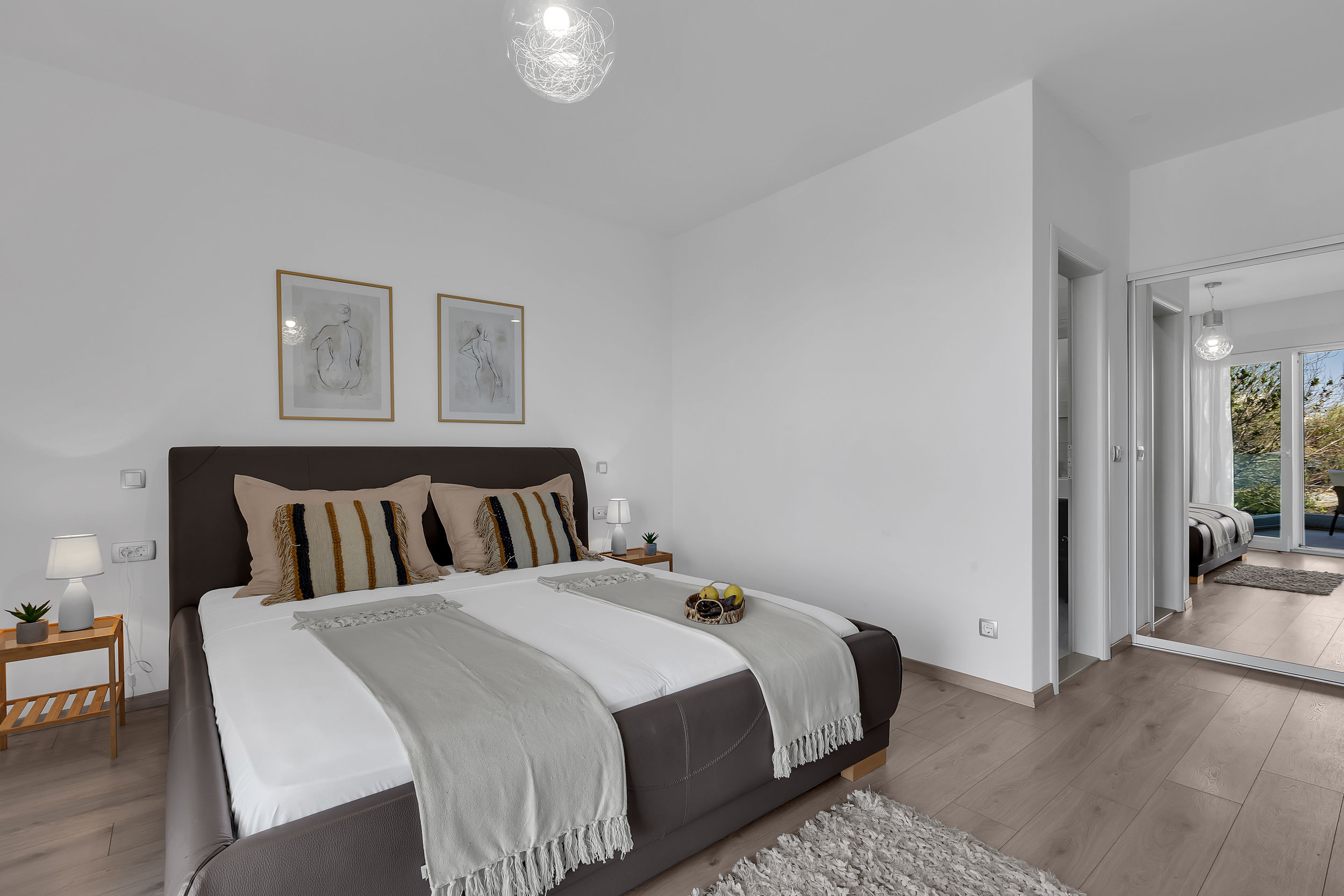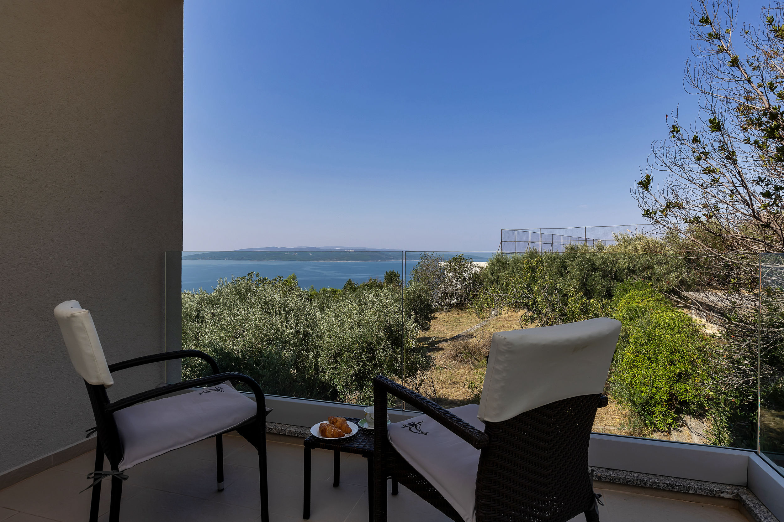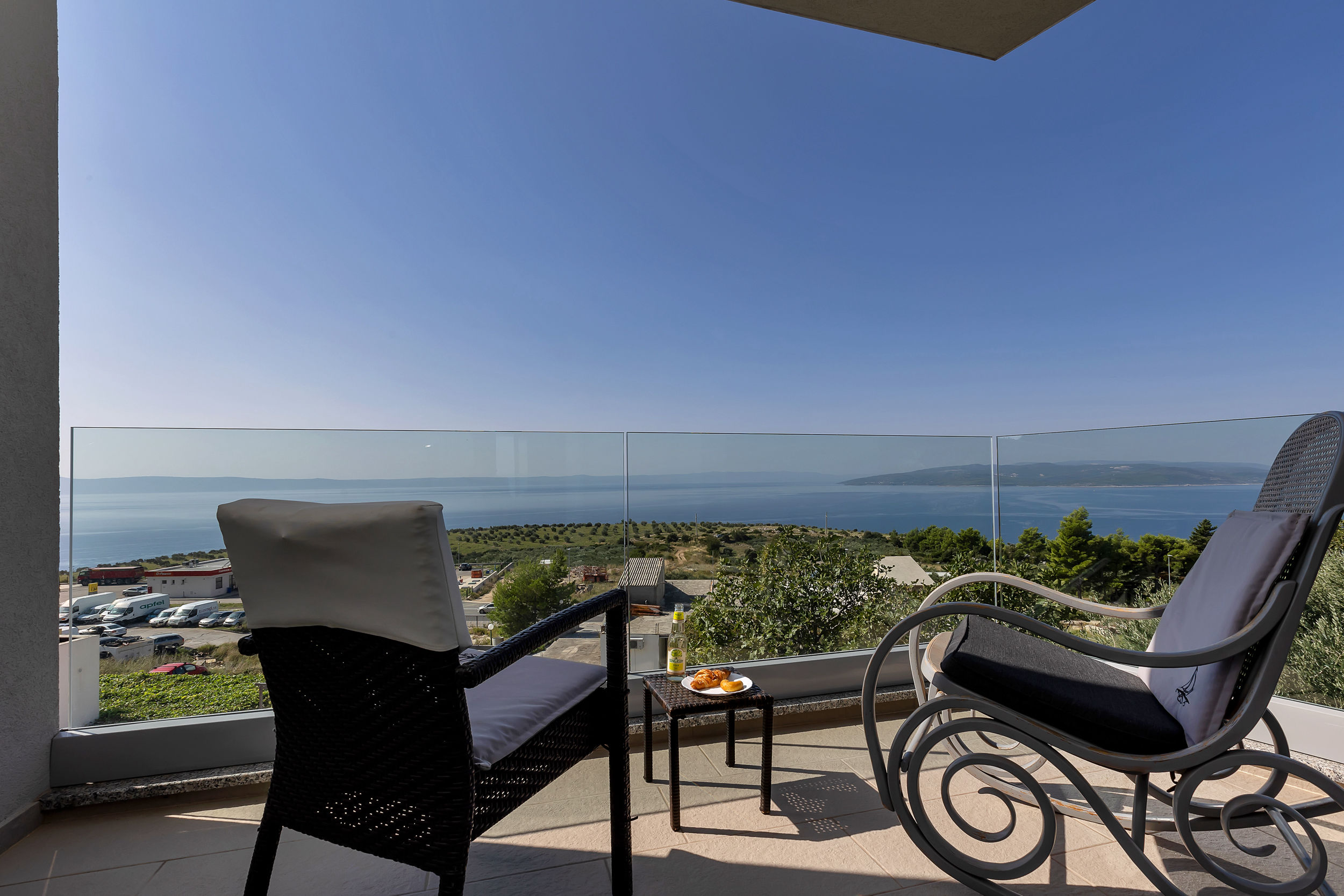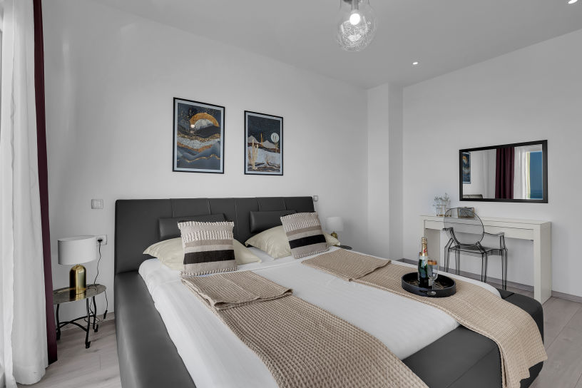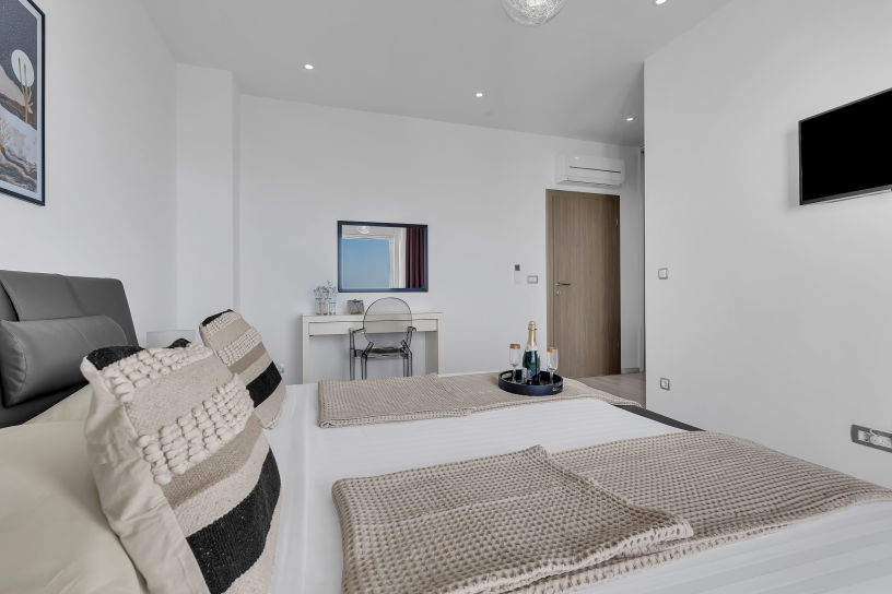 Na prvom katu smještene su tri elegantno uređene spavaće sobe, svaka s vlastitom kupaonicom i prostranim balkonom. Svaka soba ima bračni krevet širine 180 cm, ugradbeni ormar i moderan namještaj. Pogled s balkona oduzima dah – pruža se prema moru, otocima Braču i Hvaru te planini Biokovo. Sobe su dizajnirane s posebnom pažnjom, kako bi svaki gost pronašao prostor po svom ukusu.